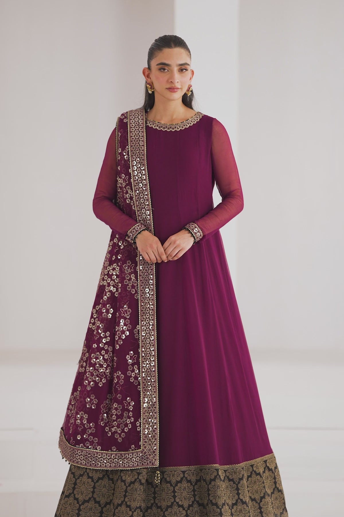 This EMBROIDERED CHIFFON UC-3057 showcases meticulous artisanship with its embroidered neckline patch and detailed borders on both front and back. The design extends to embroidered sleeve borders for cohesive elegance. A premium embroidered chiffon dupatta with ornate border completes the ensemble, while dyed chiffon material forms the front, back, and sleeves, ensuring a refined drape and sophisticated finish.